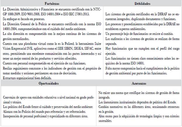 De otra parte y teniendo en cuenta que la norma UNE 66177:2005 (AENOR, 2005) indica que, "como herramienta de gestión para el análisis de la situación de partida, puede ser interesante que la organización realice un análisis DAFO (análisis de las debilidades, amenazas, fortalezas y oportunidades) de su situación u otra técnica similar" (p. 9), a continuación se presenta el DAFO de la DIRAF.