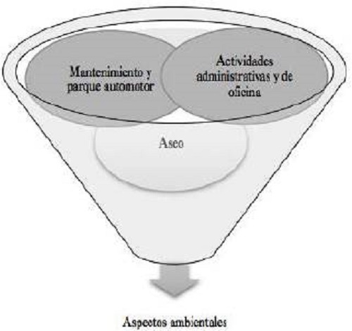En la revisión ambiental realizada, se evidenció que la gestión ambiental operativa que lleva a cabo el Ministerio de Minas y Energía, está acorde con el cumplimiento de los requisitos mínimos legales vigentes a nivel distrital y nacional sobre la disposición de residuos y consumo de agua. Sin embargo, es necesaria la articulación de todas las actividades que se llevan a cabo para consolidar un mejor desempeño ambiental. Por lo anterior, en dicho análisis se pudo establecer que los aspectos ambientales significativos son el agua, la energía y los residuos, los cuales son generados por las actividades que se presentan a continuación en la Figura