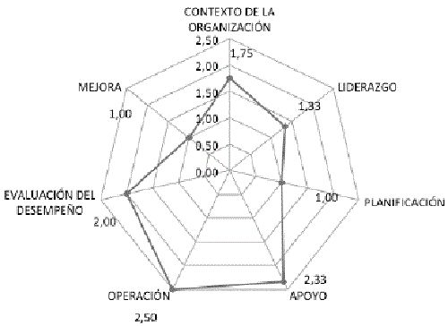 Con lo anterior, se obtuvo una línea base en un gráfico tipo radar (Figura 2), que permite establecer el estado actual del cumplimiento de los requisitos de la norma y desde el mismo, proyectar un estado deseado luego de la implementación del Sistema de Gestión Ambiental.