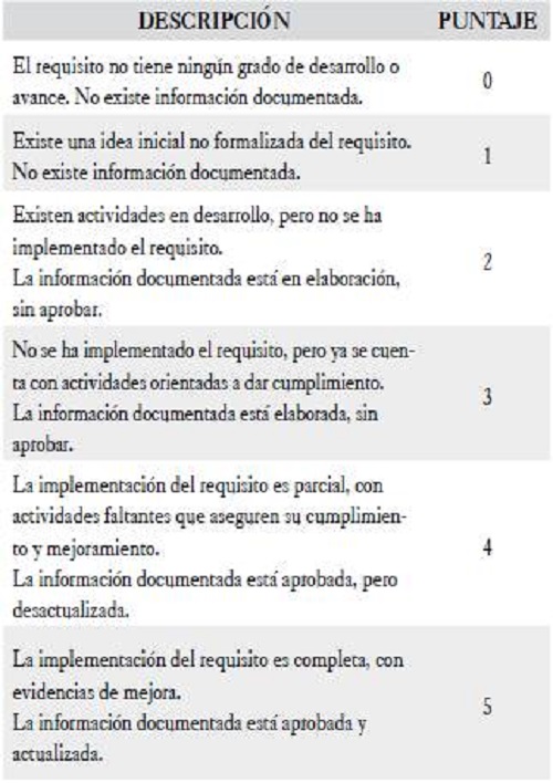 Posteriormente, con la información conseguida en la revisión ambiental inicial, el análisis del cumplimiento de los requisitos de la norma ISO 14001:2015 arrojó las brechas existentes entre lo que pide la norma y lo que se lleva a cabo actualmente, por medio del análisis de los siguientes criterios (Tabla 1) que asignan un puntaje a cada numeral.