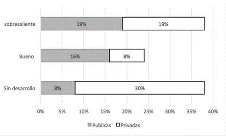 El principio menos desarrollado es el “respeto por los derechos humanos”. El 62 % de las empresas encuestadas desarrollan este tema a nivel sobresaliente, bueno. En estos temas las empresas públicas tienen mayor participación que las empresas privadas.