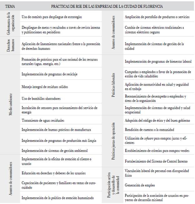 Los temas más desarrollados por las organizaciones de Florencia son los relacionados con las "prácticas laborales", en menor proporción "asuntos de consumidores" y menor aún lo relacionado con "medio ambiente". El tema menos desarrollado por las empresas de Florencia es el de "prácticas justas de operación".