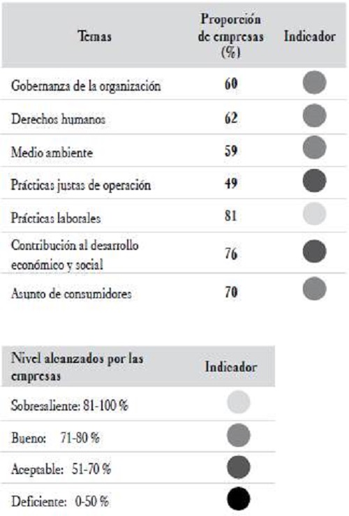 En el tema de gobernanza de la organización, las empresas despliegan sus planes y decisiones a través de comunicación interna. En el tema de derechos humanos las organizaciones se caracterizan por contar con los mecanismos básicos de ley; en materia laboral, por el estricto cumplimiento de las disposiciones legales; en el aspecto ambiental, por la realización de actividades de reciclaje y manejo adecuado de residuos; en lo referente a los usuarios, se caracterizan por contar con el servicio de atención al cliente y, finalmente, frente a la participación de la comunidad, por desarrollar proyectos que la involucren. Esto especialmente en las empresas del sector público.