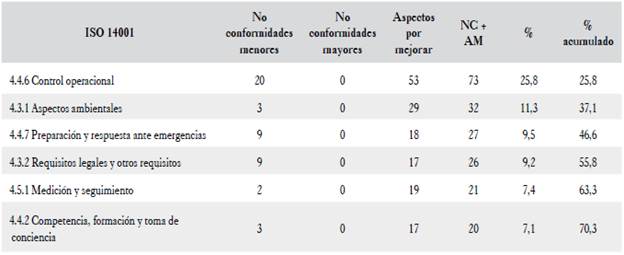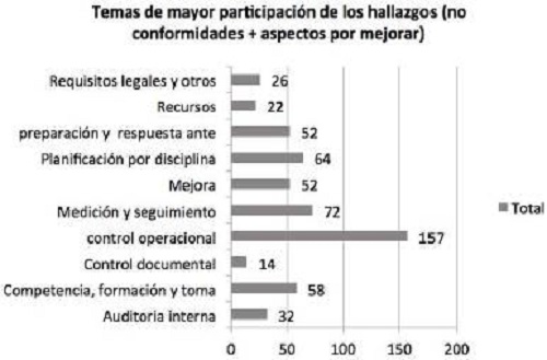 Se identificaron así los temas de gestión que con mayor frecuencia presentaron desviaciones negativas, resultados estos que se pueden deber a varios factores como: rotación en las organizaciones de personal, errores de planificación de los procesos y actividades, falta de seguimiento, baja competencia de los auditores internos, etc., pero los resultados muestran que existe dificultad en el aseguramiento de la implementación por parte de los responsables de estos aspectos, aún en sistemas de gestión maduros.