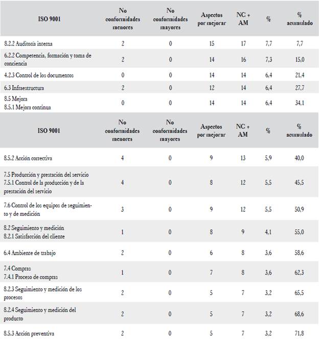 Con base en la aplicación de la herramienta para recolección de la información, se elaboraron 3 tablas, una para cada referencial, para analizar los resultados consolidados. En cada tabla se muestra el comportamiento de los hallazgos (no conformidades y aspectos por mejorar) frente a los numerales de cada norma. Se establecieron así las frecuencias de no conformidades y aspectos por mejorar frente a cada numeral de la norma y los porcentajes acumulados de hallazgos (en la columna derecha de cada tabla). Con el fin de concentrarnos en los más frecuentes se realizó corte en el 70 % del acumulado. Estos resultados se presentan en las Tablas 2, 3 y 4.
