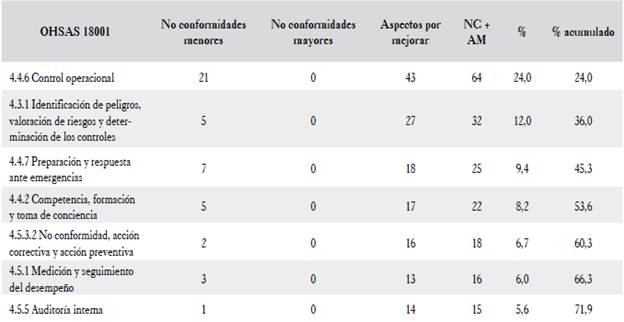 Para NTC OHSAS 18001:2007. Los siete aspectos que se encontraron de mayor debilidad fueron: el control operacional, identificación de peligros, valoración de riesgos y determinación de los controles, preparación y respuesta ante emergencias, competencia, formación y toma de conciencia, no conformidad, acción correctiva y acción preventiva, medición y seguimiento del desempeño y auditoría interna.
