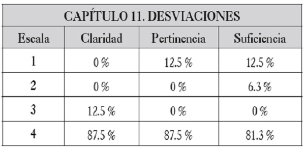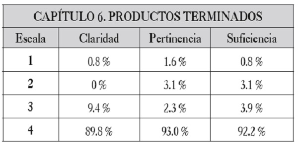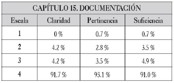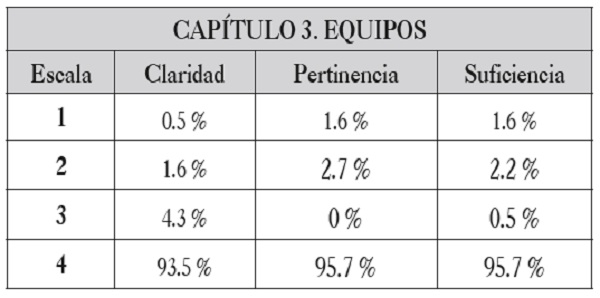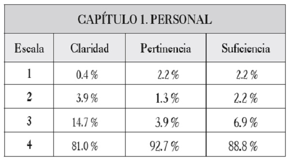 En cuanto a los resultados obtenidos de la evaluación por los expertos para este capítulo, se concentraron en la escala 4 para los criterios de claridad, pertinencia y suficiencia, tal como se muestra en la tabla 1: