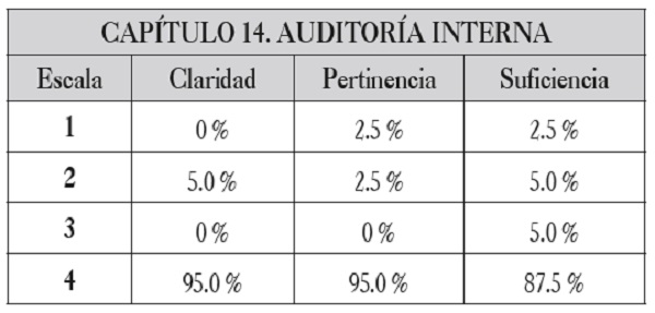 El capítulo 14. Auditoría interna, quedó constituido por los aspectos de: enfoque y seguimiento; conformado por un total de 4 requisitos, aunque la propuesta inicial que fue sometida a la evaluación por los expertos era de 5 requisitos, y de acuerdo con la integración se obtuvo el siguiente resultado: