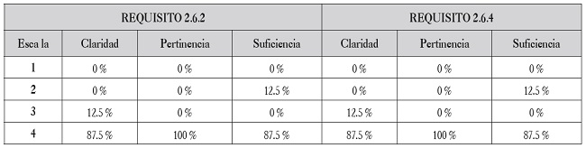 En el análisis estadístico de las calificaciones obtenidas por los expertos, se empleó la correlación intraclase (ICC) en donde los resultados arrojaron poca significancia, por cuanto los resultados obtenidos fueron muy homogéneos y no se encontró varianza entre las calificaciones y los requisitos evaluados, por lo que no se empleó otro tipo de procedimiento estadístico.