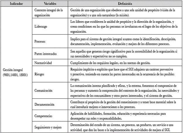 Principios de la gestión integral: la guía para el SGI propuesto se encuentra alineado bajo los principios de gestión por procesos, partes interesadas, cumplimiento normativo, gestión de riesgos, gestión de la documentación, competencia, medición, análisis y mejora, basado en el libro Sistema de gestión integral. Una sola gestión, un solo equipo (Atehortúa, Bustamante y Valencia, 2008, p. 47) y las variables incluidas del contexto integral y liderazgo.