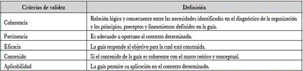 Para analizar la información suministrada por los expertos, se determinaron cinco criterios de validación que aplican para cada uno de los ítems propuestos en el instrumento: coherencia, pertinencia, eficacia, contenido y aplicabilidad. A continuación, se realiza la definición de cada uno de los criterios de validación propuestos para la guía: