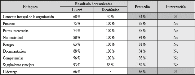 Para la evaluación de los enfoques o variables definidas, se calcula el promedio de las afirmaciones, la cuales se consideran acertadas si en las dos herramientas se obtiene un promedio superior al 80 % de afirmaciones o preguntas positivas, de lo contrario son considerados procesos débiles que requieren de manera urgente líneas de acción al interior de la organización.