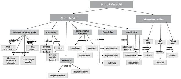 Seguidamente, se examinaron aspectos metodológicos relacionando los métodos que se han conocido para integrar sistemas de gestión, como lo son PAS 99:2012 y UNE 66177:2005 y, adicionalmente, las opciones metodología propia de la organización y, ejercicio evolutivo y ajustado de acuerdo con las necesidades (Abad, Dalmau y Vilajosana, 2014). Igualmente, como aspecto relevante, se trataron los componentes de las normas de sistemas de gestión, mirando la "estructura de alto nivel" que promueve la integración, debido a que permite responder a los requisitos equivalentes de varias normas con una misma acción (Peña y Tejada, 2015). Para comprender los requisitos de las normas sobre sistemas de gestión, se viene adoptando y construyendo desde la maestría en Calidad y Gestión Integral de la Universidad Santo Tomás en convenio con Icontec, la agrupación en tres componentes (Puentes, 2016), como son: estratégico, operativo y humano. Finalmente, se realizó la apreciación en cuanto a los resultados de una integración entre ellos, las ventajas que se esperan lograr (Karapetrovic y Willborn, 1998), dificultades que surgen en este proceso (Simon, Karapetrovic y Casadeus, 2011), aspectos estratégicos necesarios para lograr una integración exitosa (Zeng, Xie, Tam, y Shen, 2011) y desventajas que se pueden presentar (Saizarbitoria, Bernardo y Casadeus, 2007). En la figura 1. Se observan las diferentes relaciones entre los elementos.