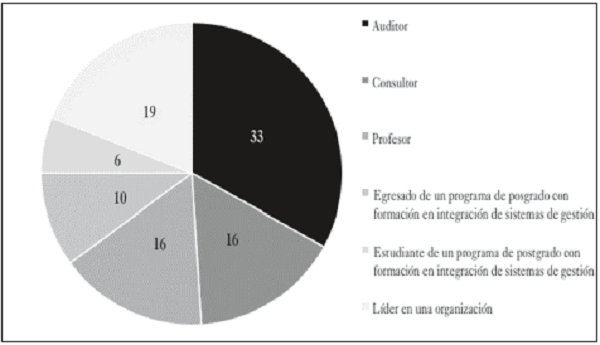 La figura 2 refleja la clasificación de la muestra como resultado de la participación de 100 actores representada en el 65 % entre auditores, consultores y profesores, y un 35 % correspondiente a egresados, estudiantes y líderes en organizaciones que han sido formados en la maestría en Calidad y Gestión Integral.