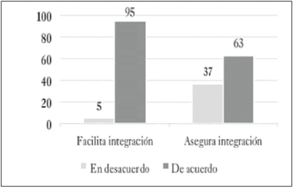 Las nuevas estructuras de las normas sobre los sistemas de gestión generan diferentes expectativas, entre ellas, si facilitaran y aseguraran la integración de los SG. En la figura 6 se consulta esta apreciación de los actores de manera general; con relación a facilitar la integración es unánime la opinión de aceptación, no siendo así, la opinión con respecto a que asegura la integración. Aunque tenga una tendencia en estar de acuerdo, existe un gran porcentaje en estar en desacuerdo, lo cual está acorde con el significado de SIG que se ha aceptado mayoritariamente en relación con la gestión de una organización y no a los requisitos de una norma, como se observa en la figura 3, mencionada anteriormente.