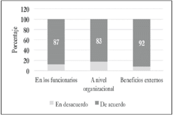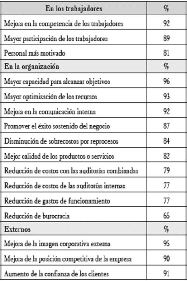 Como se observa en la tabla 3, ventajas y porcentaje de aceptación, de la misma manera se puede analizar la ventaja evaluada con el porcentaje más bajo, reflejándose en la "reducción de burocracia", lo que puede expresarse en términos de "menos procedimientos", "menos documentos", situación que se consigue una vez el SIG empieza a madurar y la organización consigue pensar integralmente.