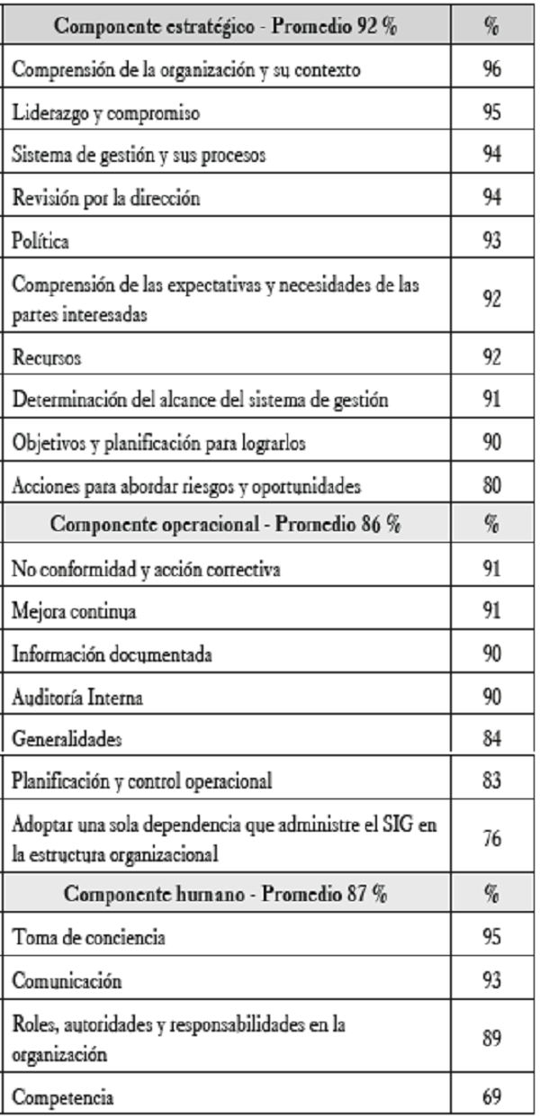 Para comprender los requisitos de las normas sobre sistemas de gestión, el convenio USTA - Icontec en el marco de la maestría en Calidad y Gestión Integral, agrupó los requisitos de la estructura de alto nivel en tres componentes, como son: estratégico, operacional y humano, estos se visualizan en la gestión de una organización y se expresan de acuerdo con el lenguaje utilizado por los trabajadores. Con respecto al componente estratégico tuvo la máxima aceptación, dado que desde esta posición se debe ejercer la dirección del proceso de integración, seguido en orden está el componente humano y el componente operacional. En la tabla 1, se relacionan los tres componentes evaluados y se pueden observar en el orden correspondiente al porcentaje de aceptación de los actores de la integración que participaron.