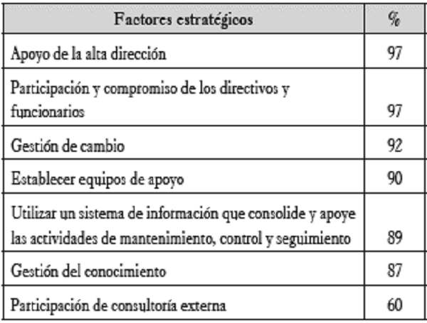 La figura 9, ilustra cómo la mayoría de los aspectos estratégicos seleccionados en el proceso de integración fueron evaluados con un alto porcentaje por parte de los actores que participaron, evidenciando su aceptación. La tabla 4 muestra específicamente los porcentajes que obtuvo cada factor, sin embargo, el factor "Participación de consultoría externa" refleja una aceptación del 60 %. En consecuencia, se puede analizar que el compromiso y la responsabilidad parte de la organización y su interés real por realizar el proceso de integración, la adopción debe venir principalmente de sus funcionarios a todo nivel jerárquico, más que de un ente externo.