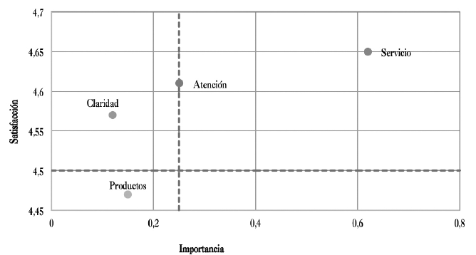 En la matriz de riesgo de satisfacción general se puede observar que el ítem mejor calificado y de mayor importancia para los clientes es el de Servicios, que comprende los servicios de cerrajería, plomería y electricidad, con un resultado de importancia de 0.62 y uno de satisfacción de 4.65, este último obtenido principalmente por la capacidad de los colaboradores al momento de prestar los servicios. El segundo mejor calificado, con una importancia media (0.25), es el de Atención al cliente, con un resultado de satisfacción de 4.61. Por otro lado, los ítems con menor calificación fueron el de Productos y el de Claridad de la información.