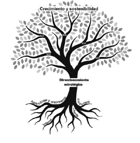 Por último, al aplicar la metodología de integración se propuso la alineación estratégica para la organización con base en un árbol (figura 3). Las raíces son las perspectivas de aprendizaje y crecimiento, los procesos internos, los clientes y el factor financiero cada uno interactuando para generar valor a la organización. El direccionamiento estratégico es el tronco del árbol, entendido como el soporte organizacional donde se sitúan las estrategias adecuadas al contexto y del que nacen las ramas del SGI, que garantizarán la sostenibilidad ayudando a cumplir los objetivos estratégicos y previniendo accidentes para no afectar la rentabilidad.
