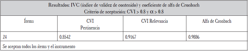 A partir del diseño de la metodología y con los datos recopilados se realizó el tratamiento estadístico (tabla 3). El primer criterio fue el IVC (índice de validez de contenido), que se evaluó mediante las ecuaciones de Lawshe con factor de corrección de Tristan, que da como resultado valores de pertinencia y relevancia de 0.66 a 1. De esta forma, obtener calificaciones a partir de 0.66 implica que los seis expertos aceptaron cada ítem al proporcionar calificaciones de 3 o 4 en pertinencia y relevancia.