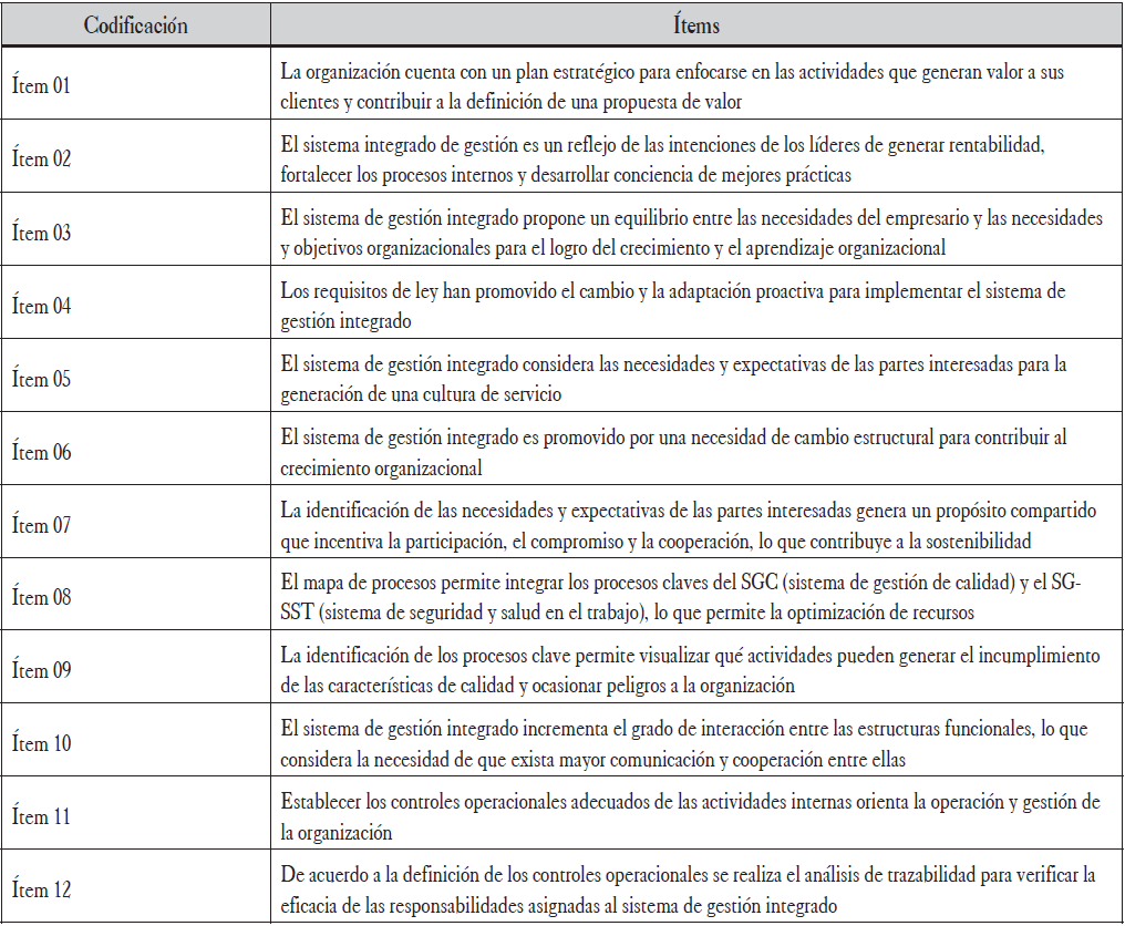 Al finalizar el diagnóstico organizacional se estableció un direccionamiento estratégico para dar inicio a un proceso de diferenciación a través de la construcción de la metodología de integración alineada con la estructura de alto nivel propuesta por la ISO. La metodología se desarrolló desde la definición de los ítems, como se muestra en la tabla 2.
