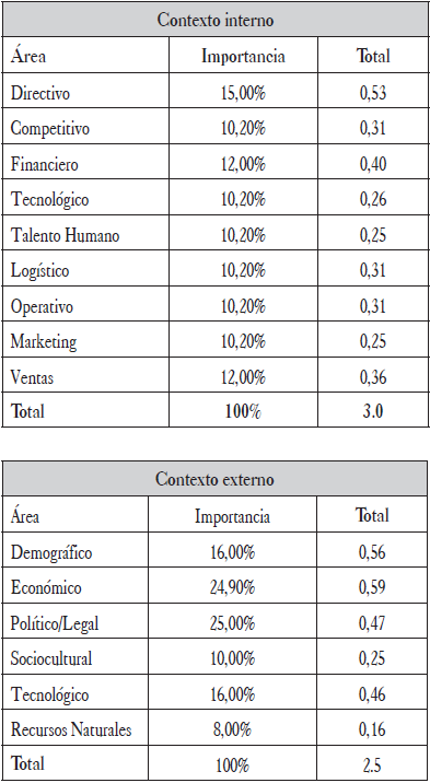 Una vez obtenidos y procesados los resultados de la encuesta, estos fueron utilizados como insumo para el análisis de las capacidades internas, operacionales y administrativas de la organización. En cuanto a sus capacidades externas se analizó el perfil de oportunidades y amenazas del entorno a través de matrices de evaluación del riesgo (Serna-Gómez, 2014).