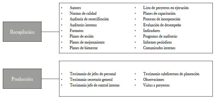 El tercer paso fue la organización de la información, que se hizo en dos etapas: en la primera, se organizó la información recopilada y la producida siguiendo el esquema de la figura 2; en la segunda, se definió la periodización en dos años pues para el diagnóstico la entidad solo suministró información de los dos últimos años. Tal información se circunscribió a la producida por personal ligado directa o indirectamente al proceso de GTH, así como al SGC de la entidad.