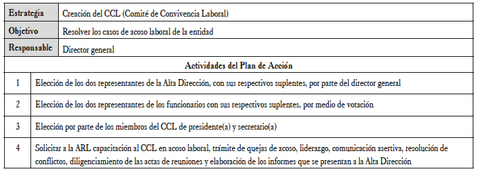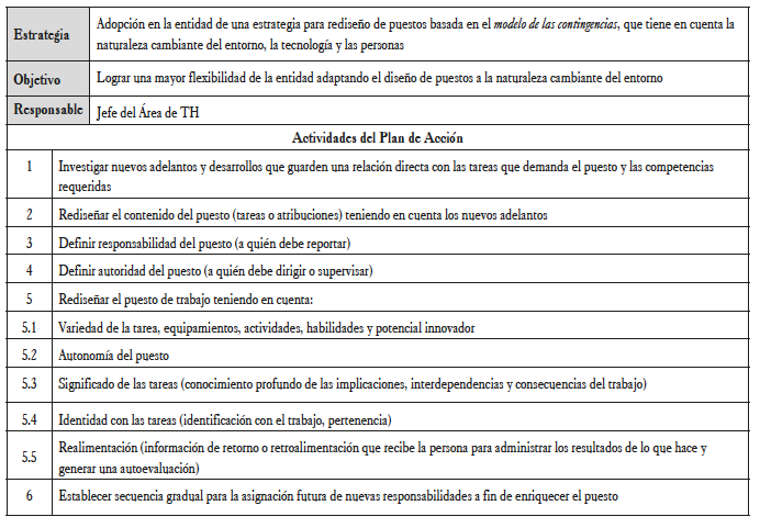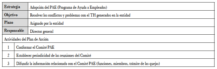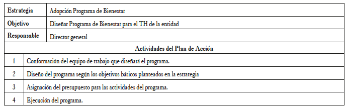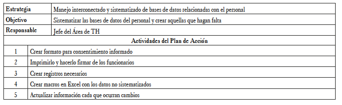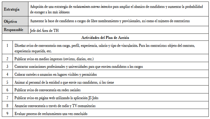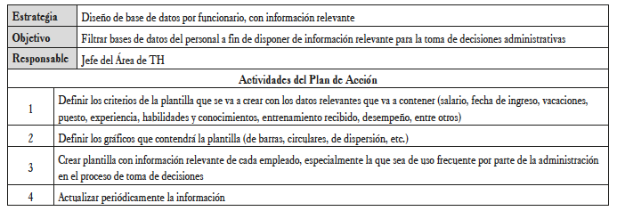 En las tablas 3 a 15 se exponen de manera sucinta laestrategia y el respectivo plan de acción para cada subprocesode la GTH.