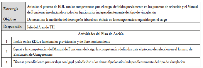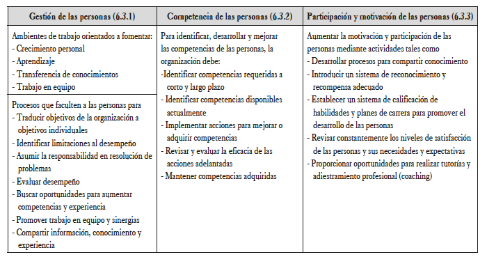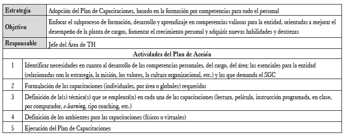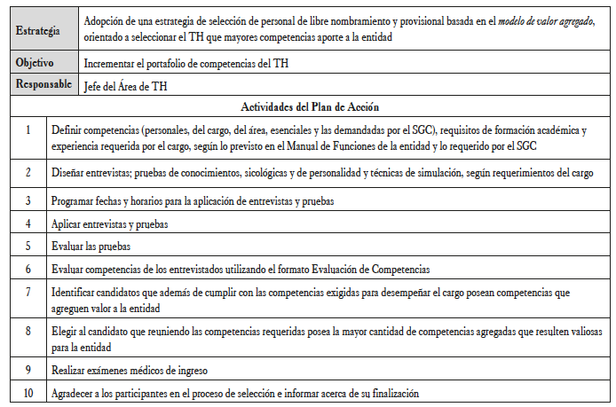 Las estrategias y los planes de acción planteados para cada una de las categorías de la GTH deberían ser suficientes para mejorar este proceso y lograr su articulación con el SGC de la entidad y muy especialmente con la norma de calidad ISO 9004:2009, que enfatiza la necesidad de gestionar bien el TH (tabla 16), la cual fue tenida en cuenta para formular la propuesta.