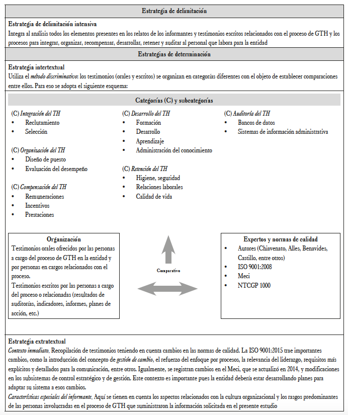 La presente investigación asume un enfoque cualitativo y utiliza como estrategia metodológica el AC (análisis de contenido) según el derrotero ofrecido por Ruiz (2004). Se escogió el AC porque en los procesos de GTH, donde la comunicación tiene un lugar preponderante, dicha estrategia provee las herramientas para analizar satisfactoriamente tales procesos no solo a partir de la comunicación, sino del contexto en el cual se dan y el vínculo existente con el SGC de la entidad involucrada.