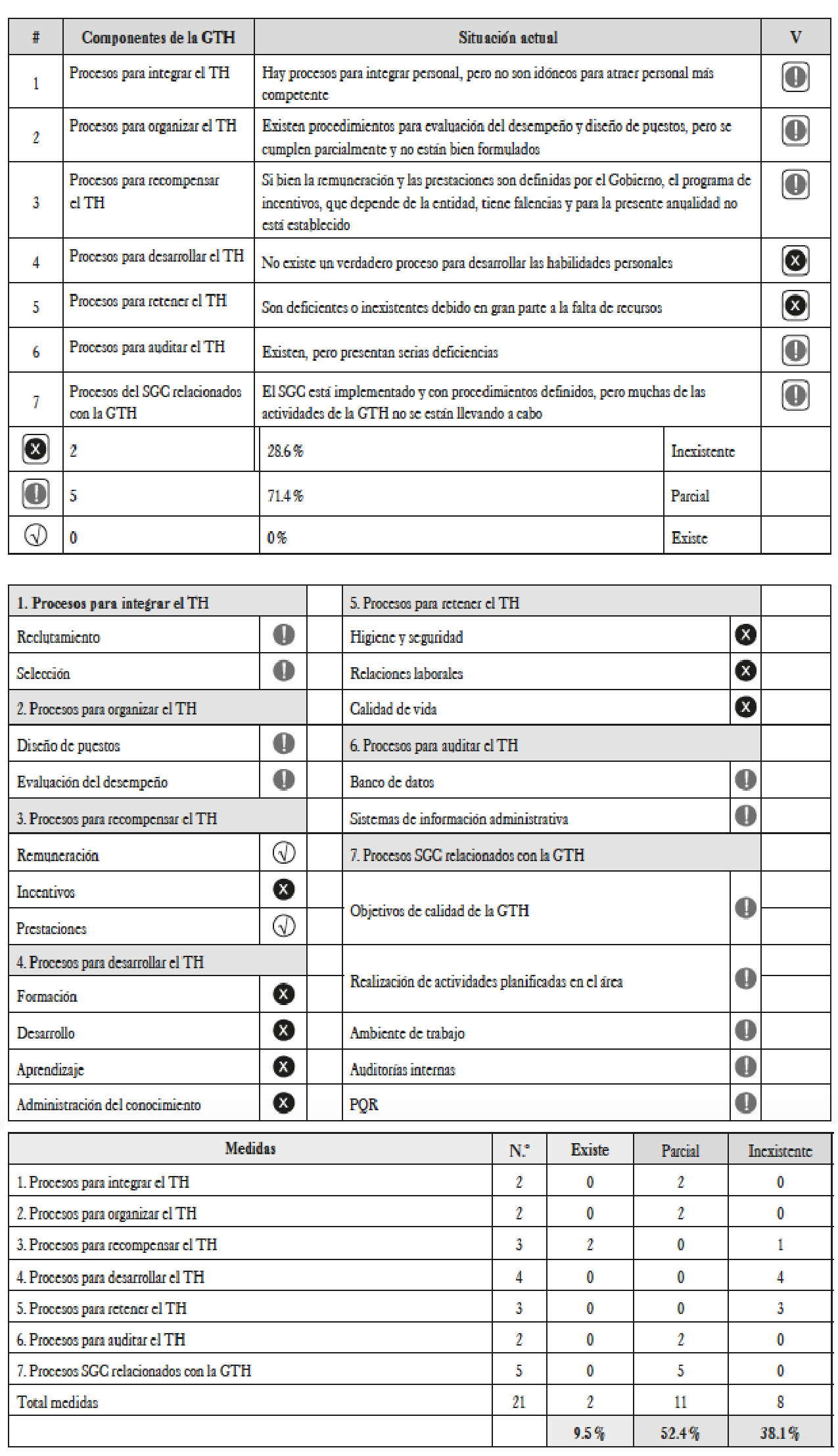 Finalmente, en apoyo a lo dicho hasta aquí, los resultados del diagnóstico muestran que actualmente más de la mitad de los procesos relacionados con la GTH y el SGC se llevan a cabo parcialmente o no son idóneos para el fin pretendido. A esto se suman aquellos procesos que no reciben la importancia debida o que sencillamente no existen en la entidad, como los que tienen por finalidad desarrollar y retener al TH.