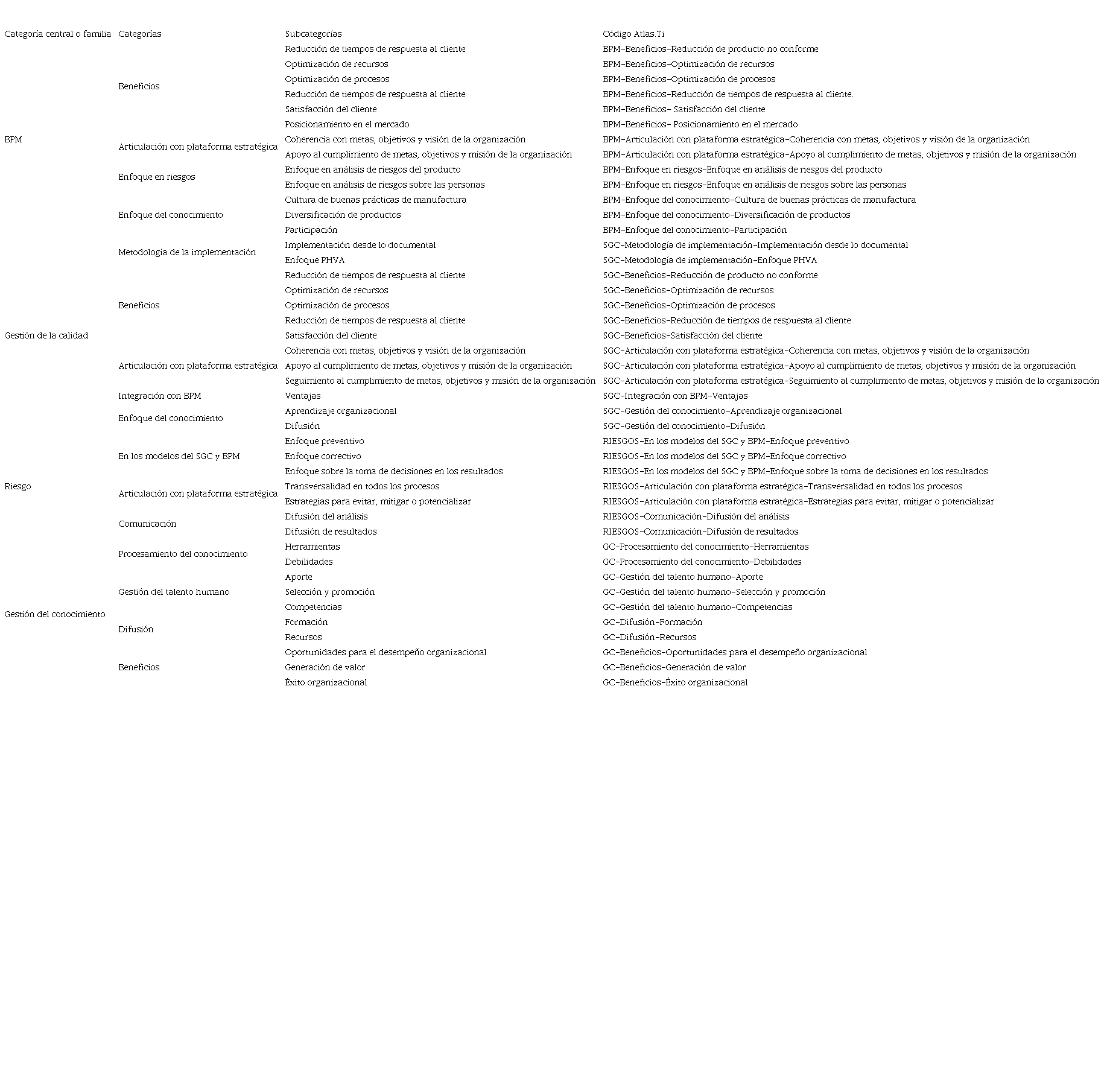 Para el desarrollo de la investigación se utilizaron dos instrumentos: en el método cualitativo, una entrevista semiestructurada al personal directivo, y en el método cuantitativo, dos encuestas, una al personal de nivel medio, que coordina y realiza seguimiento, y otra al personal de nivel bajo, que ejecuta la operación. Estos instrumentos se elaboraron teniendo en cuenta las variables y categorías establecidas para la investigación, definidas en el anexo A (“Operacionalización de la investigación”). Estas categorías surgen del análisis teórico realizado a los artículos encontrados a partir de la búsqueda bibliográfica enfocada en los sistemas de gestión involucrados en esta investigación: SGC, BPM, gestión del riesgo y gestión del conocimiento, en un rango de tiempo de cinco años, entre 2011 y 2015, en cuatro bases de datos: Science Direct, Redalyc, Scopus y Ebscohost.