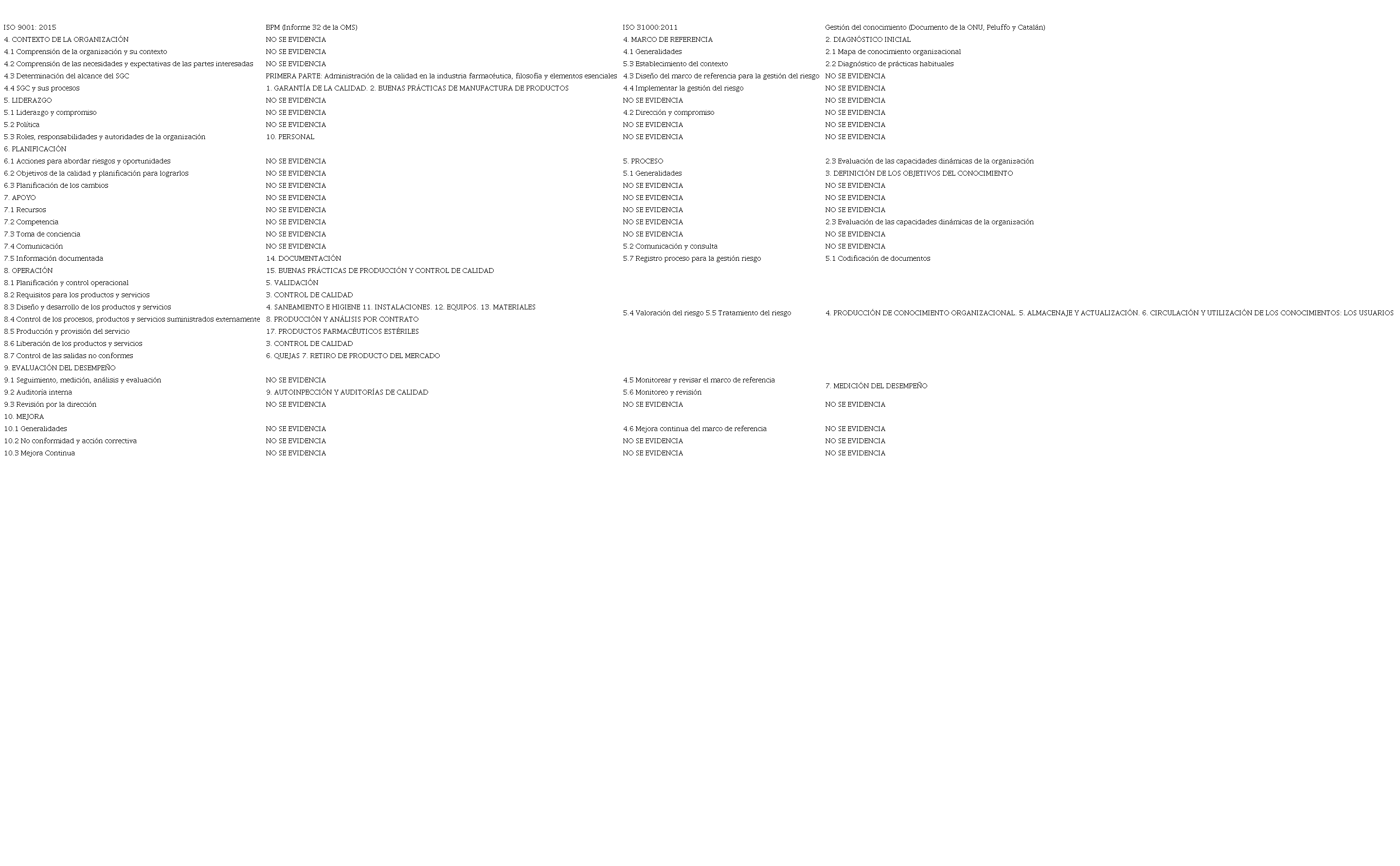 Se elaboró, entonces, una tabla de correspondencias de los requisitos específicos teniendo como base la norma ISO 9001:2015 y clasificándolos de acuerdo a la metodología del ciclo PHVA (planear, hacer, verificar, actuar). De ella se destaca la falencia que tiene la norma de BPM frente a aspectos como evaluación del contexto de la organización, liderazgo, planificación y mejora. Sin embargo, tal norma tiene una total correspondencia frente a la operación (anexo 2, “Tabla de correspondencias de requisitos de cada sistema o herramienta de gestión, basada en el ciclo PHVA”).