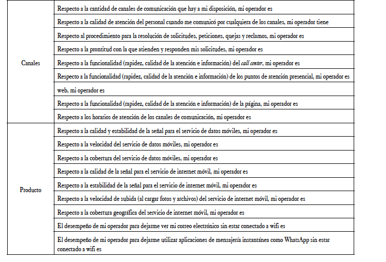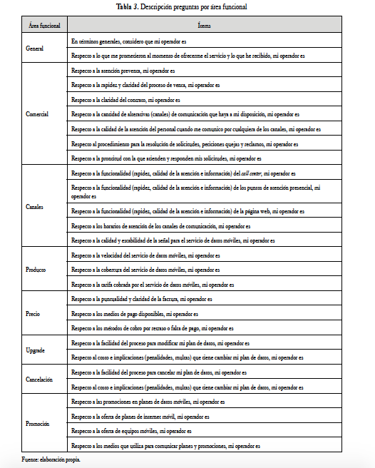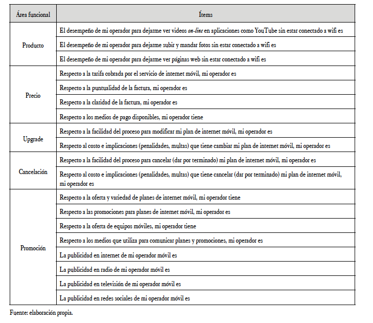 Se establecieron las áreas funcionales que comprenden los aspectos y momentos del ciclo de prestación del ser- vicio de internet móvil más relevantes para monitorear la satisfacción de los usuarios: comercial, canales, pro- ducto, precio, upgrade, cancelación y promoción. Estas sirvieron para generar los ítems exploratorios que hacen parte del instrumento de investigación desarrollado.