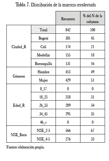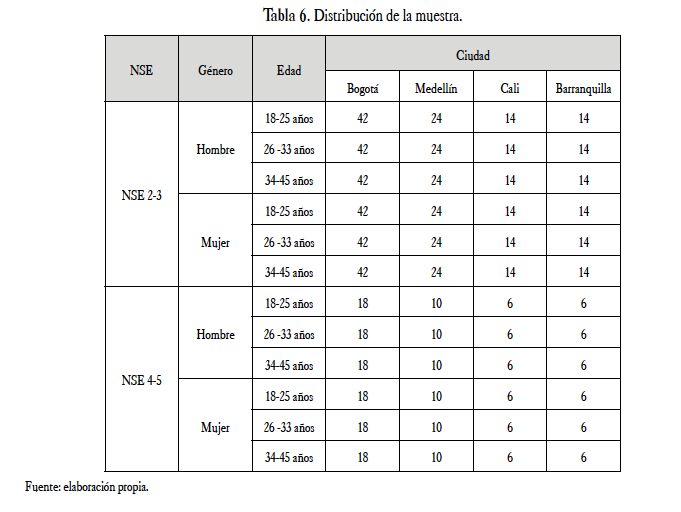 Se controlaron cuotas mediante el cruce de celdas para las variables de género, rango de edad, ciudad y nivel socioeconómico (NSE); las dos últimas aportan la proporcionalidad de la distribución respecto a filas y columnas, es decir, se mantiene la proporcionalidad entre la distribución real de la población y la distribución de la muestra en cuanto al NSE y en cuanto a población de las ciudades estudiadas.