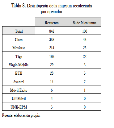 El cálculo de la muestra representativa para los usuarios de internet móvil en Colombia aplicada en el levanta- miento de la información se realizó contemplando un universo de usuarios de 5 170 000 según lo reportado por la CRC (2018) para el año 2014 y una penetración del internet móvil que, según MinTIC (2018), alcanzó el 19% para el cierre de 2013. Bajo un escenario de mues- treo no probabilístico, por cuotas, respetando un margen de error del 5% y una confiabilidad del 95%, la estimación muestral con mejor potencia fue 804 entrevistas. Las estimaciones muestrales se efectuaron mediante el software JMP.