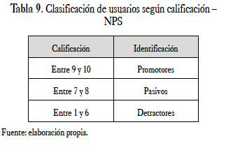 Con base en la calificación reportada en dicha pregunta se agruparon los usuarios según se muestra en la tabla 9.