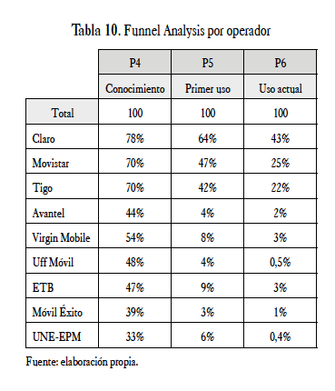 En los resultados del Funnel Analysis se puede observar que los tres operadores más grandes reportan los niveles más altos de conocimiento de la marca, primer uso y uso actual.