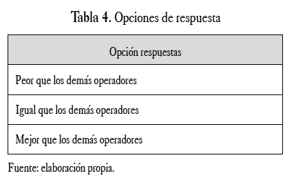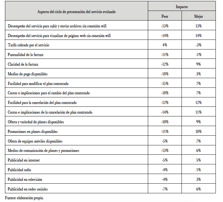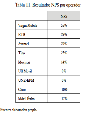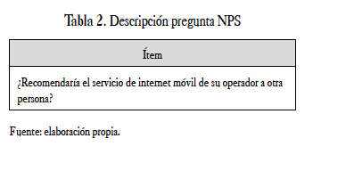 Este indicador, ampliamente utilizado en la medición de la satisfacción de clientes (Laitinen, 2018), se calculó empleando la pregunta 9 del cuestionario en la cual se indaga el nivel de recomendación del operador actual reportado por cada usuario.