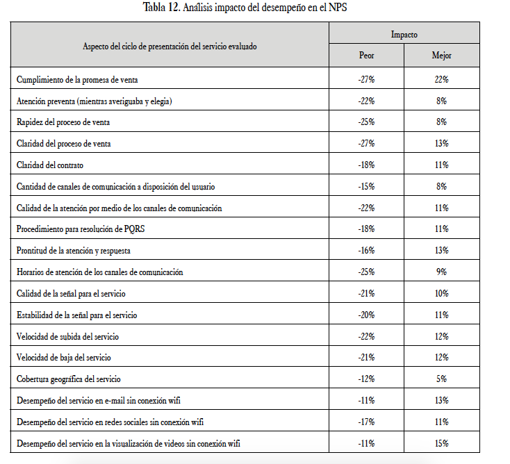 Cumplimiento de la promesa de venta: es un aspecto que afecta de gran forma el NPS si no se cumple, pero también impacta de forma significativamente positiva si el usuario percibe que el operador ha cumplido todo lo que le prometió en el momento de contratar el servicio. Este parece ser el aspecto que más debe ser trabajado por parte de los operadores si quieren mejorar su indicador de NPS en un +22%.