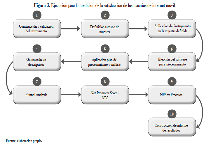En este contexto, la presente investigación propone un modelo metodológico para la medición de la satisfacción de los usuarios de internet móvil, que además de contener el NPS permita medir de una forma representativa y comparable la satisfacción de los usuarios del servicio de internet móvil en las principales ciudades de Colombia, abarcando la experiencia del usuario en todas de las fases del ciclo de prestación del servicio. En el desarrollo de la investigación, se diseñó un cuestionario y un plan de procesamiento y análisis para la medición de la satis- facción de los usuarios que fueron aplicados en el año 2016 en una muestra representativa de las principales ciudades de Colombia, lo cual permitió conocer el nivel de satisfacción de los usuarios del servicio de internet móvil prestado por los diferentes operadores a partir de su desempeño en cada uno de los momentos de la pres- tación del servicio.