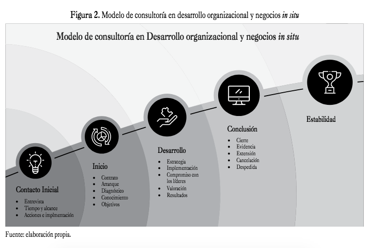 Este es uno de los procesos comunes y a grandes rasgos de consultoría en desarrollo organizacional y de negocios in situ, no es restrictivo y no es excluyente con otros elementos; para el caso de la presente nota metodológica, se intentó acotar a un proceso generalizado. Lo más valioso del proceso es que cumpla con los objetivos esperados y establecidos. En la figura 2 se puede observar el modelo.