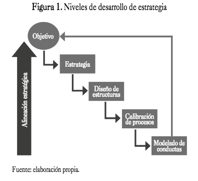Estrategia. Teniendo y entendiendo la información relevante y situación de la empresa, se determina la causa raíz de las situaciones que se desean modificar para cumplir los objetivos del proyecto. Se diseñan las estrategias por implementar, se verifica que sean acordes con la cultura que se tiene o que se busca, y se inicia la intervención operativa, que consiste en comenzar con los cambios. En esta parte del proyecto es cuando se diseñan las modificaciones a las estructuras, procesos y conductas alineadas al objetivo general y a la cultura de la organización (figura 1). El diseño de las estrategias debe seguir necesariamente ese orden, en caso contrario, será complejo intentar modificar situaciones aisladas. A partir de esta definición es que se tiene claridad de los recursos humanos, financieros y tecnológicos que se requieren para operar el cambio y también la capacidad de la organización para proveerlos o generarlos.