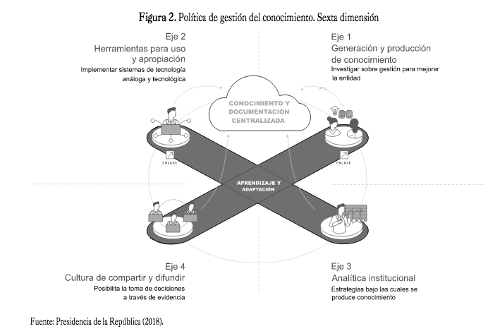 En el desarrollo de la dimensión de gestión del conoci- miento del MIPG se plantean los siguientes ejes, guías para el desarrollo de la gestión del conocimiento en las instituciones públicas: