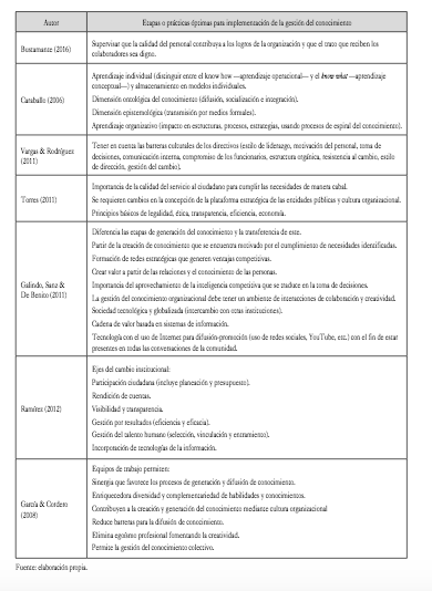 La revisión de los artículos académicos asociados a la gestión del conocimiento y al sector público relaciona- dos en la bibliografía ha permitido recabar información necesaria para tener un marco conceptual con el fin de generar opiniones y propuestas sobre el tema.