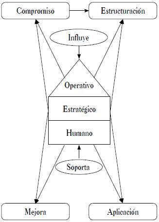 El sistema de gestión integrado arranca en la fase de compromiso, luego viene la estructuración, prosigue la aplicación y finalmente la mejora, todo esto de manera secuencial. En cada fase se encuentran involucrados los miembros de la organización, siendo el nivel estratégico el que influye con su liderazgo en el compromiso y estructuración, el nivel humano se encuentra en todas las etapas de implementación del sistema, y el nivel operativo es el que con su trabajo rutinario sirve de base para el sistema en la aplicación y mejora de este.