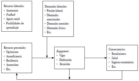 Los entornos laborales que satisfacen las necesidades de autosuficiencia y relaciones laborales tienen más posibilidades para que las actividades se realicen de la manera más correcta posible, claramente con metas y objetivos bien establecidos. Todo esto puede definir una relación con el compromiso en el trabajo, en el que Schaufeli y Bakker (2004) encontraron que los tres recursos laborales, que son la retroalimentación (feedback), el apoyo social y el entrenamiento continuo del trabajador (coaching), marcan una relación estrecha con el engagement. Sin embargo, para que esta relación compagine con la organización en sentido intrínseco, se debe adoptar con variadas herramientas que puedan ayudar a mejorar el entorno laboral como lo son tomar decisiones inteligentes, ser un buen líder, mantener una buena infraestructura, fomentar el balance entre la vida personal y laboral y celebrar logros, esto con el propósito de tener a los trabajadores integrados y con sentido de pertenencia para con la organización (Pérez, 2016). Hay que mencionar que el exceso de trabajo tiene consecuencias en rendimiento, salud y bajos ingresos económicos, mientras que el acondicionamiento correcto de los recursos gesta la motivación (Martínez, 2015). Por lo tanto, se demuestra así que no es la demanda laboral lo que conduce predictiva-mente al compromiso sino los recursos laborales. El modelo de demandas y recursos laborales de Bakker y Demerouti (2007) de la Figura 1, ofrece un panorama del proceso hacia el engagement.