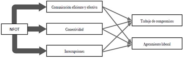 De acuerdo con Brummelhuis, Bakker, Hetland y Keulemans (2012), existen factores que pueden influir en el compromiso del trabajador, como son Internet, el teléfono celular y la flexibilidad laboral, notando que estos elementos tienden a ayudar a que el compromiso que pueda tener el trabajador sea positivo o bien se genere paulatinamente; a esto se le denomina: nuevas formas de organización del trabajo (NFOT). Dentro de este constructo, Brummelhuis et al. (2012) presentan un panorama amplio de los efectos diarios de las NFOT presentados en la Figura 4.