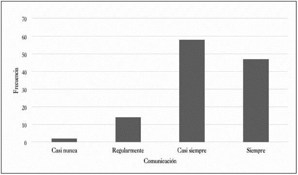 De la misma manera, la Figura 7 muestra la gráfica de medición de comunicación, que tiene un nivel de con-fiabilidad de 0.729. Aquí casi siempre existe un buen nivel de comunicación con el trabajador, sin embargo, puede acrecentarse y mejorarse con posibilidades de que siempre exista no solo para algunos sino en la empresa en general. Este nivel se determina con la mediana, que fue de 41, dato existente en el rango de "Casi siempre", cuyo límite inferior es 34 y su límite superior 42.